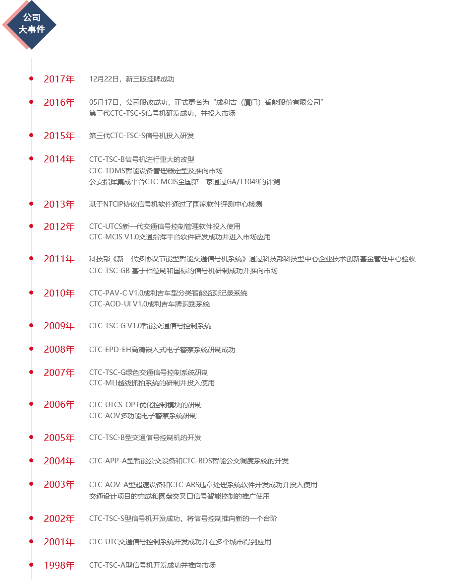 成利吉(廈門(mén))智能股份有限公司,成立于1998年,是國內最早從事智能交通領(lǐng)域產(chǎn)品研發(fā)和應用、專(zhuān)業(yè)智能交通核心軟件開(kāi)發(fā)、智能交通系統集成與運營(yíng)服務(wù)的企業(yè)之一。公司于2016年5月正式更名為成利吉(廈門(mén))智能股份有限公司,并于2017年12月22日新三版成功掛牌。